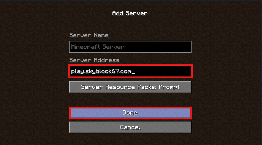 2. Click on the Add Server and enter play.skyblock67.com to Server Address field and press Done.